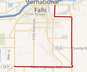 The roadway ran east–west between US 71 and US 53; and then ran north–south from US 53 to MN 11 on the east side of International Falls.[4] Legally, MN 332 was defined as Route 332 in the Minnesota Statutes § 161.115(263).[5]