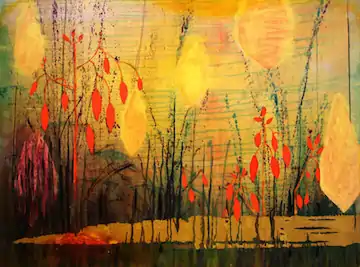 Working with imagery from the natural world, Lehr creates layered abstract compositions with unconventional materials. 60 Minutes correspondent Morley Safer referred to her as "the mistress of light".[8] The lush flora of her Florida home has a profound influence on her aesthetic vocabulary. Lehr seeks to express the natural world's essence and patterns, so that her artwork expresses the reality of nature better than a naturalistic rendering.[5] On closer inspection, they reveal a myriad of contrasts — natural imagery with abstract gesture, dense planes with translucent washes, and rich, abraded textures with a crisp, contemporary structure.[2] Art historian Irving Sandler describes her use of imagery thus: “What makes Lehr's work different is the specificity of her references to nature. I was trying to think of any other artist working in this tradition who did it quite as explicitly as Mira did and I couldn’t come up with one."[8]