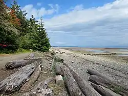 Miracle Beach Park comprises 137 hectares (340 acres), with approximately 665 m (2,182 ft) of shoreline along the Strait of Georgia on the east coast of Vancouver Island. The beach component of the park extends outward approximately 340 to 410 m (1,115 to 1,345 ft) from the shoreline to the tide's low water mark. The tide floods this sandy foreshore area twice daily. The extensive beach area is an intertidal sandbar, the result of coastal sediment transport from Williams Beach, and other nearby shorelines, driven by winds and waves from the southeast, as well as sediment from spilling out from Black Creek and Oyster River. Following this sediment transport pattern, the sands of Miracle Beach are being transported northward to Saratoga Beach. The shoreline is composed of a cobble and gravel surface with driftwood logs. Native species growing in the saline environment of the shoreline include gumweed, American dunegrass, Vancouver wildrye. The intertidal area is heavily trafficked by park visitors but animal life that can be found there include sand dollar, purple shore crab, green shore crab and green burrowing anemone. Coho Salmon swim up Black Creek from the sea in the fall.[13]