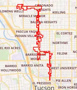 Located north of downtown Tucson, the Miracle Mile Historic District is a significant commercial corridor connected to the development and alignment of Tucson's northern segment of U.S. Route 80, U.S. Route 89, and Arizona State Route 84.[2] Throughout the mid-twentieth century, this commercial strip, known as “Miracle Mile,” functioned as the northern vehicular gateway of Tucson for travelers traversing the nation. The Miracle Mile Historic District follows the alignment of the following extant arterials: Stone Avenue, Drachman Street, Oracle Road, and Miracle Mile. Also included in the district and associated with the highway site is a two block segment of Main Avenue lined with trucking transfer warehouses and roadside commercial buildings, as well as four blocks of Flores Street containing a cluster of small motels. The bulk of the contributing resources, facing or within one block of the historic highway alignment, relate to mid‑century auto culture and were constructed in 1920 through 1963 during the district's period of significance. While the district has been rendered discontiguous by development, the identified segments have sufficient significance and integrity to meet National Register criteria.[3] Two designated highways are routed down the Miracle Mile Historic District. The Stone Avenue, Drachman Street and Oracle Road segments of the Historic District are part of Historic U.S. Route 80, while the West Miracle Mile segment is part of Arizona State Route 77.[4][5]