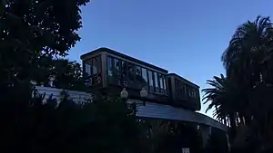 The tram consists of a single elevated track, with a single 2-car train running back and forth between the two stations. It uses rubber tyres and is cable hauled.[7] It operates as a fully automated guideway system.[8] The train has a total capacity of 120 passengers. One-way capacity is 1,800 passengers/hour.