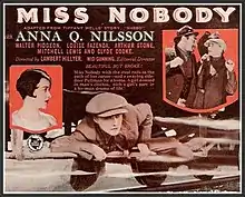 Miss Nobody is a 1926 silent film drama produced and distributed by First National Pictures and directed by Lambert Hillyer. The film is based on a short story by Tiffany Wells called "Shebo"; the likely feminine pronunciation of hobo. The stars of the film were Anna Q. Nilsson and Walter Pidgeon, then in a very early role in his career.[1] The plot of this film bears a striking resemblance to Beggars of Life, made two years later at Paramount.
