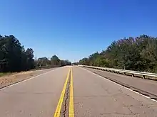 MS 182 becomes an unnamed divided highway and runs between fields to the north and residential and commercial development to the south of the road. The highway comes to an interchange with the US 82/MS 12/MS 25 freeway in Clayton Village, after which it narrows back into a two-lane undivided road that runs through rural land with some commercial development. The road passes to the south of the Mississippi State University Golf Course before it crosses under US 82/MS 12/MS 25 without an interchange. MS 182 runs through a mix of farm fields and woods with some homes as it heads into Lowndes County. The highway becomes South Frontage Road and reaches an interchange with US 45 Alt. Following this, the road continues through rural land before it reaches the community of Mayhew, where it heads to the north of the East Mississippi Community College Golden Triangle Campus and passes under a Kansas City Southern Railway line. MS 182 runs through woods before continuing straight through farmland. Before the road reaches the roadbed of the US 82/MS 12 freeway, the MS 182 designation formally ends with the roadbed continuing only as Frontage Road.[7]