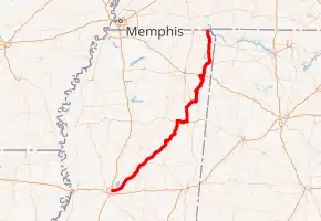 Legally, Mississippi 25 is defined in Mississippi Code Annotated § 65-3-3, as follows: "Begins at or near Jackson, Hinds County, thence in a northeasterly direction to or near Carthage, Louisville and Starkville, thence along U.S. 82 to its intersection with U.S. 45A, thence along U.S. 45A to Muldon, thence to or near Aberdeen, Amory, Smithville, to U.S. 78, thence continuing to Belmont, Dennis, Tishomingo, Iuka and to the Mississippi-Tennessee state line north of Cross Roads, Tishomingo County."[3]