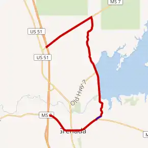 MS 333 Scenic begins in the city of Grenada at an interchange with Interstate 55 (I-55)/MS 7 (exit 206). It heads southeast, concurrent with MS 8, as a four-lane divided highway through a major business district, where it has an intersection with South Street, before narrowing to an undivided highway to curve eastward and pass through neighborhoods. The highway has an intersection with U.S. Route 51 (US 51) before traveling along the southern side of downtown for several blocks to cross a bridge over Batupan Bogue. They now pass through the neighborhood of Futheyville, where MS 333 Scenic splits off and heads north as a two-lane road. Here, this is the officially designated section of MS 333. It almost immediately has an intersection with Old Highway 8 (which provides access to nearby Hugh White State Park) where MS 333 ends, and MS 333 Scenic leaves the Grenada city limits winding its way north through some hilly woodlands for a few miles (passing by a civil war era confederate fort) to cross the dam's spillway (inadvertently also crossing the Yalobusha River) before having its first intersection with Toe Road (provides access to MS 332) before passing directly over top of Grenada Dam. The highway has another intersection with Toe Road as it passes by the North Abutment Campground before leaving the dam area and winding its way through hilly, wooded terrain for the next several miles. MS 333 Scenic comes to an intersection with MS 7, which lies not even 500 feet from the Yalobusha County, and they head southwest through farmland for several miles to have another interchange with I-55 (exit 211) just south of the community of Hardy. MS 333 Scenic ends here, MS 7 splits off to head south along I-555, and the road ahead is unsigned MS 729 which travels for 0.3 miles (0.48 km) to come to an end at an intersection with US 51.[3]