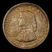 The bust of frontiersman Daniel Boone, who lived in Missouri for the final quarter century of his life, appears on the obverse.[15] Anthony Swiatek and Walter Breen, in their 1988 book on commemorative coins, note speculation that the obverse may have been inspired by Albin Polasek's sculptured bust of Boone in the Hall of Fame for Great Americans in New York City. Boone wears a deerskin jacket and a coonskin cap. The centennial dates, the name of the country and the coin's denomination surround the bust. The reverse depicts Boone with rifle and powder horn, and a Native American—Swiatek and Breen interpret the frontiersman as sending away the Indian, who bears a shield and peace pipe, apparently dramatizing Montgomery's desire to show the white man supplanting the Indian in Missouri; Breen stated "as though this was something to brag about".[16] The 1921 Report of the Director of the Mint describes the interaction as "Daniel Boone, with powder and rifle, directing the attention of an Indian to the westward course of the white man".[15] The Missouri Centennial half dollar, which shows Boone on either side, is one of the few coin designs in United States numismatic history to have the same individual depicted on both sides; other such depictions include Boone himself on the 1934–1938 Daniel Boone Bicentennial half dollar, Lafayette on the 1900-dated Lafayette dollar and the frontiersman on the 1936 Elgin, Illinois, Centennial half dollar.[17]