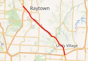 | Unity Village | 7.843 | 12.622 | Colbern Road, Bannister Road | Blue Parkway designation exits the highway | |