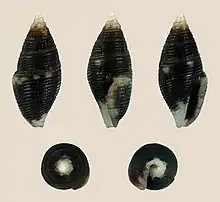 The shell has an elongately-oval shape with rather acute spire. Its color is thick, black brown (if dry greyish, perhaps by the action of alcohol) with white upper whorls and base. It shows a few white spots on the whorls about the periphery and a row of white quadrangular blotches at the upper margin of white base. It contains about 8 whorls, of which nearly 2 smooth ones form the protoconch, . The subsequent whorls are only very slightly convex, separated by a rather conspicuous suture, which is however not very distinct by the spiral grooves, with which the whole shell is encircled. These grooves are rather deep, the subsutural and median one of body whorl however less so. The lirae are granose on 2 or 3 postnuclear whorls, lower on they are only closely punctured, the lirae remaining smooth, but for fine growth striae. The aperture is oblong and narrow. The peristome is thin, with only traces of a varix, internally with very faint, irregular wrinkles. The columellar margin is straight, smooth above, slightly plicate below by the basal grooves.[2]