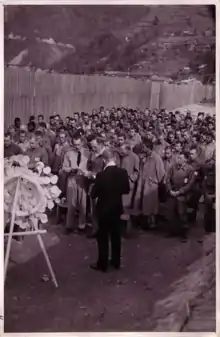 Camp Commander Lt. Sukeo Nakajima leads the first anniversary memorial service to commemorate the 45 prisoners who died in the first year at the camp. November 26, 1943.