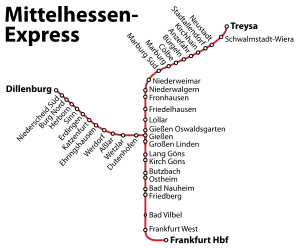 The Mittelhessen-Express runs on the Treysa–Giessen–Frankfurt (RB41) and Dillenburg–Giessen–Frankfurt (RB 40) routes. Trains coming from Treysa and Dillenburg are normally coupled together in Giessen and run together for the rest of the route. In the opposite direction the trains are uncoupled at Giessen. On Sundays and on Saturday afternoons and evenings trains are not coupled or uncoupled. On the common section the Mittelhessen-Express stops only at the stations of Frankfurt West, Friedberg, Bad Nauheim and Butzbach. Since the beginning of the 2010 timetable, the Mittelhessen-Express has stopped every two hours in Bad Vilbel and at stops that were previously served only by Regionalbahn trains between Giessen and Friedberg.