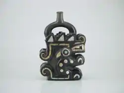 Ultimately the species of the animal portrayed in unknown. This piece could represent a mystical animal, half feline, and half bird, decorated with nacre incrustations. The eye of this mystical character is made of turquoise. If we look at the object to the right, we can see a feline; while if we look at it to the left, we can see a bird. The eye is the link between the two. This object corresponds to the concept of the creative duality, which is very important for pre-Columbian societies. The feline’s snout is disproportionate, and the animal is seated with his paws up, in a fighting position. The nacre triangles represent the crest of the bird, which is a symbol of importance and power. The crests are at the same time a symbol for the union between the upper world and the underworld. This is very important because it explains one of the major concepts of Ancient Peru: the fact that the upper world (the world of the Earth) receives the water and the light coming from the sky, creating life.