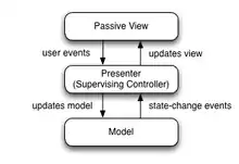 - The view is a passive interface that displays data (the model) and routes user commands (events) to the presenter to act upon that data.