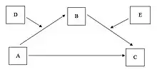 In addition to the three manners proposed by Muller and colleagues in which moderated mediation can occur, Preacher, Rucker, and Hayes (2007) proposed that the independent variable A itself can moderate the effect of the mediator B on the outcome variable C. They also proposed that a moderator variable D could moderate the effect of A on B, while a different moderator E moderates the effect of B on C.[2]
