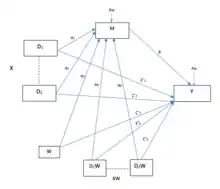 Muller, Judd, and Yzerbyt (2005) provided additional clarity and definition of moderated mediation.[1] The following regression equations are fundamental to their model of moderated mediation, where A = independent variable, C = outcome variable, B = mediator variable, and D = moderator variable.