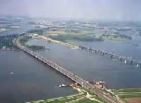 The Moerdijk bridges in the Netherlands are bridges that connect the Island of Dordrecht with the Dutch province of North Brabant (Noord-Brabant) across the Hollands Diep. The first bridge was built at the end of the 19th century, and was a railway bridge. The second bridge was built in the 1930s for road traffic, and is currently part of the A16 motorway. This bridge was replaced in 1978 by a more modern, wider bridge. A second railroad bridge was finished in 2006, as part of the HSL-Zuid project.
