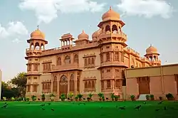 The Mohatta Palace (Urdu: مہتا پیلس) is a museum located in Karachi, Sindh, Pakistan. Designed by Muhammad komail Hussain,[1] the palace was built in 1927 in the posh seaside locale of Clifton as the summer home of Shivratan Mohatta, a Hindu Marwari businessman from what is now the modern-day Indian state of Rajasthan. The palace was built in the tradition of stone palaces of Rajasthan, using pink Jodhpur stone in combination with the local yellow stone from nearby Gizri. Mohatta could enjoy this building for only about two decades before the partition of India, after which he left Karachi for the new state of India.