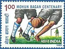 Mohun Bagan celebrated their 100th anniversary in 1989. A grand torch rally was held for the occasion with the rally starting from Basu Bati in North Kolkata and covered several important places in Mohun Bagan's history before reaching the Mohun Bagan Ground.[19] The then Prime Minister Rajiv Gandhi arrived for the celebrations and during his speech, he referred to Mohun Bagan as "The National Club of India".[28] Fittingly, Mohun Bagan again won the IFA Shield during this anniversary by defeating Tata Football Academy in the final by a solitary goal.[28] Mohun Bagan became the first club to be honoured by a postage stamp from the Indian Government on their centenary year.[29]