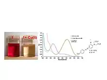 Most commonly, the change (the signal) is observed by measuring the various physical properties of the chemosensor, such as the photo-physical properties seen in the absorption or emission, where different wavelengths of the electromagnetic spectrum are used.[12][13] Consequently, most chemosensors are described as being either colorimetric (ground state) or luminescent (excited state, fluorescent or phosphorescent). Colorimetric chemosensors give rise to changes in their absorption properties (recorded using ultraviolet–visible spectroscopy), such as in absorption intensity and wavelength or in chirality (using circularly polarized light, and CD spectroscopy).[14]