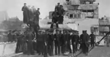 Goeben was stationed in the Mediterranean at the start of the war; she escaped from pursuing Royal Navy ships to Constantinople. The ship, along with the light cruiser Breslau, was transferred to the Ottoman Navy soon after arrival. Strategically, Goeben played a very important role: she helped bring the Ottoman Empire into the war as a member of the Central Powers, and by acting as a fleet in being the ship prevented Anglo-French attempts to force the Bosporus, and similarly stymied a possible advance by the Russian Black Sea Fleet. Goeben was retained by the new Turkish government after the war. Only slightly modified from her original configuration, the ship remained on active service with the Turkish Navy until being decommissioned on 20 December 1950; she was stricken from the Navy register on 14 November 1954. Two years earlier, when Turkey joined NATO in 1952, the ship was assigned the hull number B70.[1] The ship was unsuccessfully offered for sale to the West German government in 1963. Without a group willing to preserve her as a museum, the ship was sold to M.K.E. Seyman in 1971 for scrapping. She was towed to the breakers on 7 June 1973, and the work was completed in February 1976.