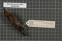 It was formerly considered a subspecies of the dusky myzomela (Myzomela obscura), but phylogenetic evidence indicates that both are distinct species, and it has thus been split by the IUCN Red List, BirdLife International, and the International Ornithologists' Union.[2][3][4]