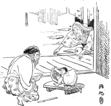This is the result of development of the literary "Momotarō", which had been handwritten and printed since the early Edo period into Meiji.[2] One significant change is that in most examples of Edo Period literature, Momotarō was not born from a peach, but born naturally to the elderly couple who ate the peach and regained their youth. Such subtypes are classed as kaishun-gata (回春型) "rejuvenation" type, whereas the now conventional subtypes are termed kasei-gata (果生型) "birth from the fruit" type.[2]
