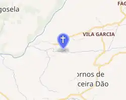 The monastery is located five kilometres from the centre of the municipal seat of Mangualde, accessed from the Estrada Nacional E.N.16 at the 105.6 kilometres marker, in the village of Vila Garcia, then by the municipal road 1441, along a dirt road towards the Moinhos do Dão.[1] Santa Maria is located in an isolated, rural landscape, situated on a fertile valley of the Dão River. It is set between the Serra de Santo António dos Cabaços and the Serra de Fagilde, relatively close to the settlement of Vila Garcia.[1]