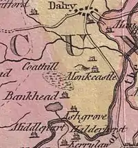 In 1866 the estate amounted to around 360 acres.[21] William Campbell Miller died intestate at the age of fifteen in 1857. At the time of his death his town residence was Saxe Coburg Hall, Edinburgh, and the following properties were listed in the inventory of his estate: Baidlandhill and Windyedge in the parish of Dalry; Hill of Fergushill, Kilwinning parish; Craighead, and Craighead Mill; High Monkcastle and Low Monkcastle; Hillend; Mansion House Grange; Cottages at Old House; Crofthead; Heatterhill; Bannock; and Monkridding House.[22]