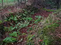 A rocky glen runs up from Monkcastle with a significant waterfall and a listing as part of a Scottish Wildlife Trust local site for nature conservation. The glen was partly formed from quarrying work for freestone.[33] A previous course of the Monkcastle Burn can still be followed and this probably resulted from the quarrying intruding into the original course of the burn at the head of the glen resulting in a waterfall and the burn then following the bed of the glen itself. The geology consists of Carboniferous limestone, macroporphyritic basalt, and an overlay of basalt and boulder clay. The quarry workers are thought to have made used of Old Monkcastle as office space for storage, etc. The OS maps show that quarrying had ceased by the start of the 20th century.[33]