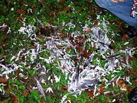 On 8 November 1576, midwife Bessie Dunlop, resident of Lynne, in Dalry, was accused of sorcery and witchcraft. She answered her accusers that she received information on prophecies or to the whereabouts of lost goods from a Thomas Reid, a former barony officer in Dalry who died at the Battle of Pinkie some 30 years before.[29] She said she first met him while walking between her own house and the yard of Monkcastle, and after a discussion he disappeared through a hole in a wall or dyke, apparently too small for a normal person to pass through.[30] Bessie also met with the warlock Laird of Auchenskeigh at a thorn tree near to Monkcastle.[31]