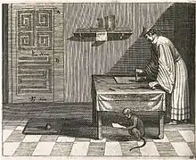 A number of the beasts were captured and put in a pen, to be cooked for the magistrate of a Tonkinese town. They picked the fattest of their number and thrust it weeping forth, to await the magistrate's pleasure in a covered cage: "The Commandant asked what thing this was, and the [xingxing] spoke from within the cage, and said, 'Only your servant and a jug of wine!' The Commandant laughed, and cherished it." Of course the clever, winebibbing animal became a treasured pet.[42]