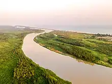 Approximately 400 km (250 mi) long, and draining a basin of about 20,000 km2 (7,700 sq mi), it rises between the town of Sokodé and the border with Benin, and flows south. Along the southern portion of the river towards its mouth, it forms the international boundary between Togo and Benin. The river drains into the Bight of Benin through an extensive system of brackish water lagoons and lakes, including Lake Togo.[1] Only the part of the river nearest its mouth is navigable. Most of the river's basin on the upper tableland is cultivated for maize, yams, rice, cotton and cassava.[2]
