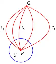 - Let be an open disk in the complex plane centered at a point and be a complex-analytic function. Let be another point in the complex plane. If there exists a family of curves with such that and for all the function is continuous, and for each it is possible to do an analytic continuation of along then the analytic continuations of along and will yield the same values at