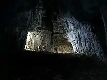 On an area of 2.8 km2, 454 caves have been identified. Two networks exist under this small area. To the north the trou des Auges, ressaut de 108 m, trou des Filous, grotte Arva, Cuvée des Ours, which connected with the Granier system, located in the center of the plateau, form a network of 55,725 m for a depth of 635 meters.[3] The latter consists of the Gros trou Bib, trou des Panaches, gouffre des Myriades, Étoile du Berger, trou Lilou and trou Mathieu for the main cavities. To the south the system Balme à Collomb-grotte des Pincherins of 8,336 metres (27,349 ft) for 283 metres (928 ft) of elevation gain, well known for its cave bear deposit[4] is not attached to the Granier system. On November 13, 1988, cavers Pierre Guichebaron and Marc Papet discovered an extension to the Balme à Collomb cave on the west side of the mountain at an altitude of 5,577 feet (1,700 meters) that contained the skeletons of over 1,000 cave bears that date between 24,000 and 45,000 years. The current Granier massif is now only part of a larger plateau reduced by erosion.