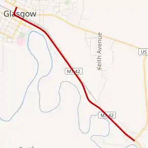 MT 42 begins at a T-intersection with MT 24 southwest of Glasgow. MT 24 makes up the northern and southeastern leg of the intersection, while MT 42 heads to the northwest. For most of its length, the route is situated between the Milk River and the Northern Transcon. MT 42 and the railroad enter Glasgow from the southeast and both curve to the north-northwest; in town, the highway follows First Avenue South. Near the city's Amtrak station, MT 42 turns to the north onto Sixth Street and crosses beneath the railroad tracks. Shortly thereafter, it ends at its intersection with US 2.