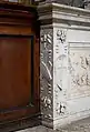 The most valuable works of art in the chapel are the aediculae of the baptismal font and the holy oil (oleum sanctum) on either side of the main altar. They were assembled in 1657 from 15th-century marble fragments and integrated with new additions. The original pieces are exquisite sculptural works by the school of Andrea Bregno. Pico Cellini claimed that the sculptures of the saints in the shell-headed niches had previously decorated the rear side of Bregno's old main altar which was demolished in 1627 (the front side is kept in the sacristy). This theory remains disputed because that statues might have come from other demolished monuments in the basilica like the lost Borgia tombs.[2] The identification of the four saints are uncertain except the figure of John the Baptist (with scroll and lamb) on the baptismal font and John the Evangelist (with chalice) on the font of the holy oil. The symbols, the haloes and the hair of the figures are gilded. The shafts of the Composite pilasters are decorated with ecclesiastical symbols: different types of crosses, cardinal's hats, torches, wreathes, palm branches, lamps. The shields with the crosses on the pilasters of the aedicula of the holy oil indicate that these parts came from the Cybo chapels. On the dropped friezes there are pairs of cherub heads between bunches of fruits. Inside the niche of the baptismal font there is a relief depicting the Baptism of Jesus. The coats of arms on the plinths belong to Cardinal Flavio Chigi.