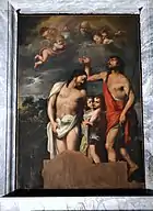 The Baptism of Christ on the altar was painted by Pasquale Rossi and was first mentioned in the sources in 1674. It is one of the few public works of the Vicentine painter in Rome. The lower part of the painting is seriously damaged due to the burns caused by the votive candles on the altar ledge. The biblical scene is set in a dark, lyrical landscape. The menacing sky with the dense clouds and the simple log cross by the side of the two embracing, vivacious little angels alludes to the earthly fate of Jesus. While pouring water on the head of Christ, John turns his head towards the dove of the Holy Spirit and the figure of God surrounded by angels. The gestures of Jesus express humility and the acceptance of his destiny. On this painting "De Rossi demonstrates a stylistic maturity in the field of ecclesiastical and devotional painting, a field sometimes neglected by the critics", states Ilaria Miarelli Mariani.[8] The painting is set in a simple stone frame. Like the other later additions in the chapel the altarpiece is too large for the space delineated by the original painted architecture. Above there is a small fresco of the Madonna and the Child Holding a Globe with the figure a bearded donator (?) in a rectangular niche framed by painted laurel garlands.