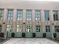 Stanton designed the courthouse to be built around a previous courthouse, which was demolished, leaving a landscaped courtyard space surrounded by an arcade. The two and three story concrete structure cost $450,000, with two stories in concrete and a glass-and-steel third floor the rear of the complex. It is extensively embellished by Mora's sculpture and reliefs, with comparatively sober detailing around the perimeter and more extensive decoration on the courtyard elevations, with customized relief friezes at the tops of the fluted rectangular arcade columns. Small bronze castings decorate the doors and a large freestanding Mora sculpture in travertine forms the centerpiece of the courtyard. Subjects were drawn from the history of California. There are a total of 62 busts of individuals from California history in the window spandrels, and five travertine reliefs of scenes from Monterey County history.[2]