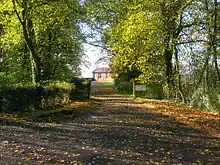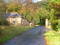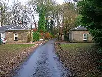 Beside the driveways running to the Montgreenan mansion house from the Lodges are a number of red sandstone pillars, these are milestones. They look like gatepost-like and were 'rescued' after they became redundant or 'in the way' as a result of road widening works, etc. They have been brought from various places in Ayrshire. Sir James Bell of Montgreenan had a hobby of collecting milestones and other stones.[20] Many Ayrshire milestones were buried during the Second World War as an invasion precaution. Two are near the West Lodge and three of these milestones are near the East Lodge at Montgreenan Mains.
