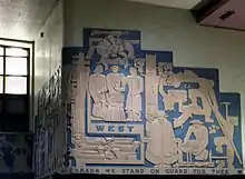 The east and west interior walls of the station feature two large bas-reliefs depicting Canadian life, arts and industry, designed by Charles Comfort and executed by Sebastiano Aiello.[12] Included in the bas relief are a few of the lyrics of "O Canada", which was only an unofficial national anthem when the station was built. The lyrics are in French on the east side of the station and in English on the west side. Canadian artist Fritz Brandtner created the three large chiselled stone reliefs depicting Mercury, Apollo and Poseidon on the station's north exterior wall. The representations of Mercury and Poseidon measure approximately 2.5 m by 4.5 m. Apollo is larger but visual access is very limited. These were obscured by the 1958 construction of the neighbouring Queen Elizabeth Hotel. It is disputed whether Comfort or Brandtner created the thematic stone medallions depicting water, land and air transportation on the station's west, south and east exterior walls. Stylistically, however, the bas-relief medallions bear a strong resemblance to the frieze by Charles Comfort created for the Toronto Stock Exchange building in 1937.