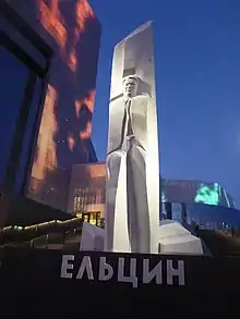 The Monument to Boris Yeltsin in Yekaterinburg (Russian: Памятник Ельцину, romanized: Pamyatnik Yeltsinu) is a monument to Boris Yeltsin, the first President of Russia, Soviet party, Russian political and state leader, one of the founders of postsoviet Russia, in Yekaterinburg, the oblast center of his native region where he lived and worked for a long time. The monument is located near Boris Yeltsin Presidential Center. The monument is regularly subject to vandalism.