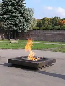 The square was laid out with vegetable gardens during summer 1942 to help feed the city during the siege of Leningrad, and also hosted an artillery battery.[13] The square's former name, the Field of Mars, was restored on 13 January 1944.[1] It underwent further reconstruction between 1947 and 1955, and in 1957 a new design for the central area of the memorial by Solomon Maiofis resulted in a paved square with an eternal flame lit on 6 November 1957, in memory of the victims of various wars and revolutions.[1][2][4][13] The flame, lit from the open-hearth furnace of the Kirov Factory, was the first eternal flame in Russia.[1][4] The flame from the Field of Mars was also used to light the eternal flame at the Piskaryovskoye Memorial Cemetery on 9 May 1960, and at other memorials in Saint Petersburg.[1] The flame was delivered to Moscow in 1967 and on 8 May it was used to light the eternal flame on the Tomb of the Unknown Soldier near the Kremlin Wall.[1][4]