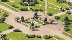 The layout of the square was further developed following the installation of the monument, with gardens and pathways to the design of Ivan Fomin.[1] The redesign was completed in 1921, and on 25 October the square was transferred to the city's Garden and Park Administration. In 1922 the Comintern and the All-Russian Central Executive Committee proposed creating a monument to the October Revolution, but the project was never carried out.[1] The last burial on the square, that of the secretary of the Leningrad city committee of the CPSU Ivan Gaza, took place on 8 October 1933.[1][4] The graves are marked with granite plaques, some with a single name, others with multiple names. Another plaque states "Here are buried those who died in the days of the February Revolution and the leaders of the Great October Socialist Revolution who fell in battles during the Civil War".[4]
