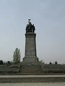 The Monument to the Soviet Army (Bulgarian: Паметник на Съветската армия, Pametnik na Savetskata armia) is a monument located in Sofia, the capital of Bulgaria. There is a large park around the statue and the surrounding areas. It is a popular place where many young people gather. The monument is located on Tsar Osvoboditel Boulevard, near Orlov Most and the Sofia University. It portrays a soldier from the Soviet Army as a freedom fighter, surrounded by a Bulgarian woman, holding her baby, and a Bulgarian man. There are other, secondary sculptural composition parts of the memorial complex around the main monument, like the group of soldiers which have been used many times as a canvas by political artists. The monument was built in 1954 on the occasion of the 10th anniversary of the liberation by the Soviet Army, which is the general Russian interpretation of the complex Military history of Bulgaria during World War II.