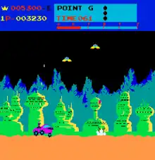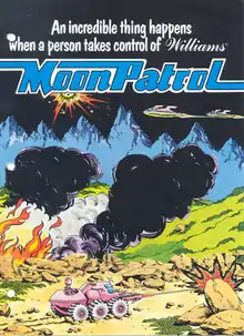 Moon Patrol (ムーンパトロール, Mūn Patorōru) is a 1982 arcade video game developed and released by Irem. It was licensed to Williams for distribution in North America.[5] The player controls a moon buggy which can jump over and shoot obstacles on a horizontally scrolling landscape as well as shoot aerial attackers. Designed by Takashi Nishiyama, Moon Patrol is often credited with the introduction of full parallax scrolling in side-scrolling games. Most of the home ports were from Atari, Inc., sometimes under the Atarisoft label.