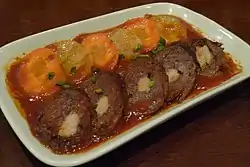 Morcón or morconito (also spelled morkon or morkonito), is a Philippine braised beef roulade made with beef flank steak stuffed with hard-boiled eggs, carrots, pickled cucumber, cheese, and various sausages.[1] It is commonly served during Christmas and other festive occasions.[2]
