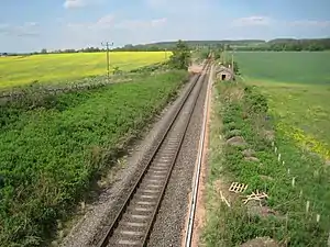 ![]() The site of the station, looking west towards Alves, in 2017 | |