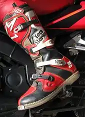 Motorcycle boots are associated with motorcycle riders and range from above ankle to below knee boots. They have an outside of a typical boot but a low heel to control the motorcycle. To improve motorcycle safety, motorcycle boots are generally made from a thick, heavy leather and may include energy absorbing and load spreading padding, metal, plastic and/or composite materials to protect the motorcycle rider's feet, ankles and legs in an accident. For use in wet weather, some boots have a waterproof membrane lining such as Gore-Tex or SympaTex.