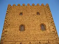 The Tower of Motta ("donjon" or "Keep" in English) was built between 1070 and 1074 by the will of the Count Roger of Hauteville. The massive tower with a rectangular plan, with a base of about 21.5 by 9 by 17 metres (71 by 30 by 56 ft), is about 21 metres (69 ft) high and is a typical defensive structure of the early Middle Ages. The roof terrace retains almost intact battlements (22 merlons with rounded head).