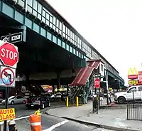 This elevated station has three tracks and two side platforms with the center express track not used in revenue service.[14] The 4 stops here at all times.[15]