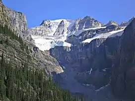 Mount Fay is a mountain located on the border of Alberta and British Columbia on the Continental Divide in the Canadian Rockies. The mountain forms part of the backdrop to Moraine Lake in the Valley of the Ten Peaks of Banff National Park. It was named in 1902 by Charles E. Fay, an early explorer of the Canadian Rockies. He was a member of the party who attempted Mount Lefroy in 1896 when the first mountaineer to be killed in the Canadian Rockies occurred.[1]
